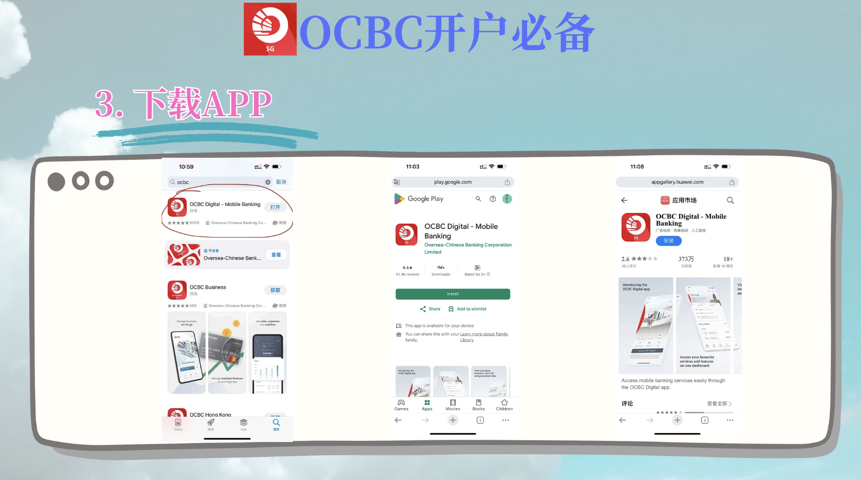 OCBC digital,国内的苹果应用商店可以下载。 - 安卓手机需要科学上网一下,下载谷歌应用商店,然后下载OCBC digital。